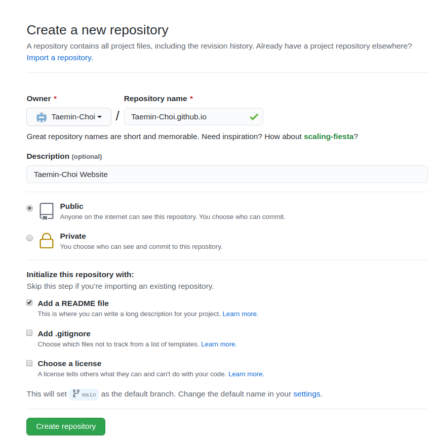 실제로 페이지를 운영하려면 Jekyll를 설치하여 로컬 영역에서 커스터마이징 후 원격저장소로 업데이트하는 것을 추천드립니다.